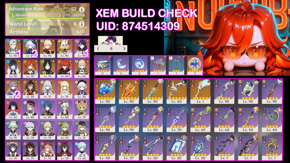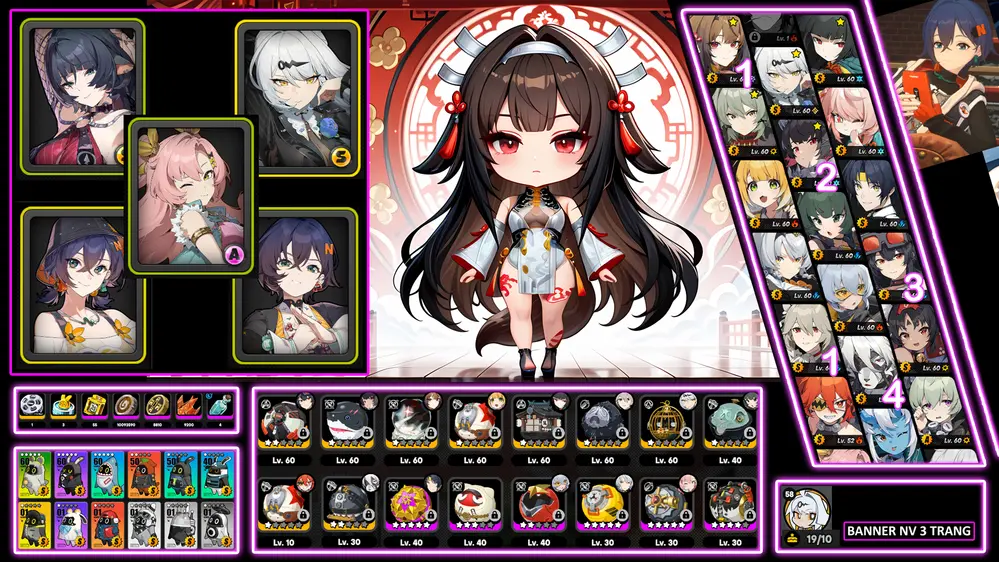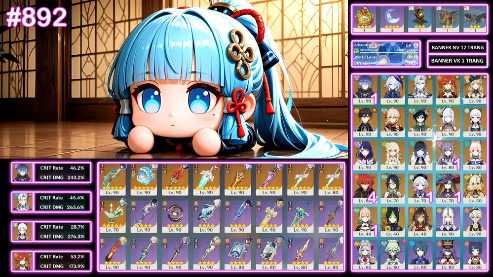 Flins C1 + Neu + Fu + Mavuika + Ayaka trấn kèm nhiều char khác banner nhân vật 12 trang cho ae lấy char mình thích
