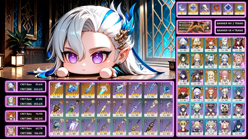 AC VIP ayaka c6 , diluc c6 qiqi c6 cùng đồng bọn cực nhiều char cho ae hệ sưu tầm , kẹp rất nhiều cung mệnh ngon , có kaeya c6 4 sao cực hiếm