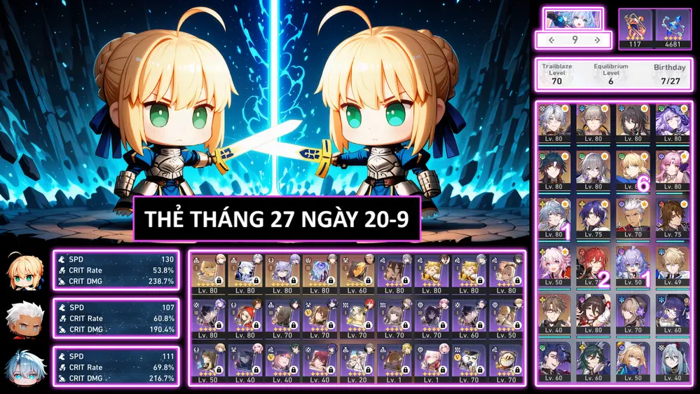 [#3212 NGUỒN CN VIP DÁT VÀNG META CHỜ EVERNIGHT] SABER + PHAINON TRẤN + CASTORICE TRẤN + FIREFLY TRẤN + RATIO TRẤN + SUNDAY TRẤN + ROBIN TRẤN + AVEN E1 TRẤN + TRIBBIE + HYACINE + FUGUE + TOPAZ + RUAN MEI E1 + JADE + FEIXIAO + THE HERTA + ANAXA + FU XUAN + ARCHER + BẢO HIỂM 10 TRANG + NHIỀU TÀI NGUYÊN