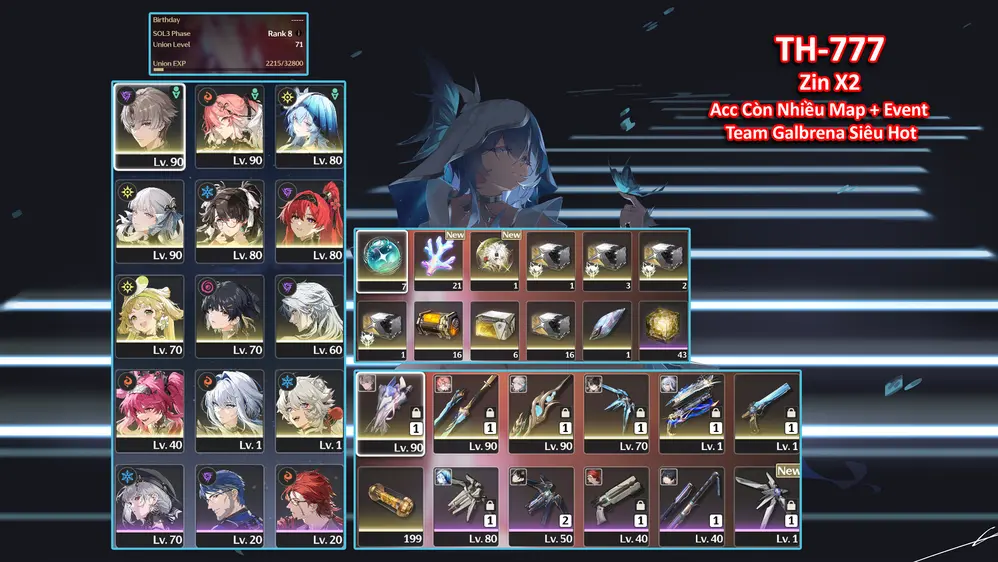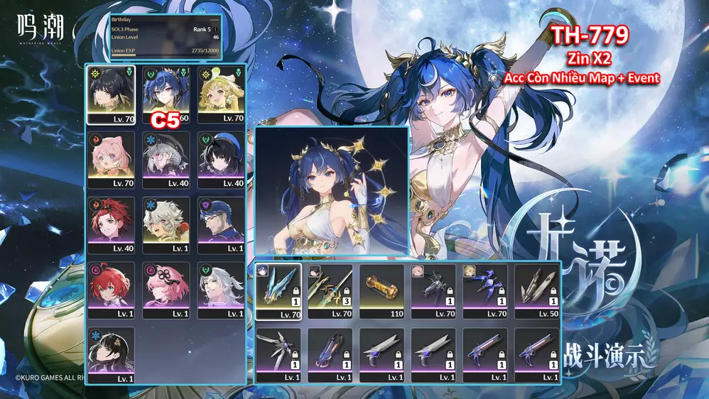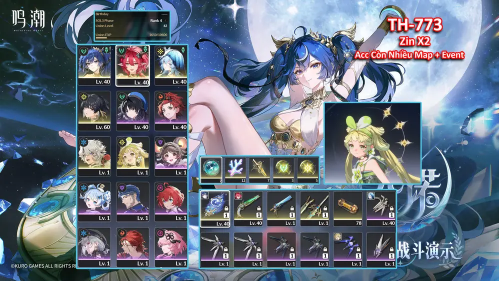 [Siêu Phẩm ] TH-777 Xiangli Yao (Trấn) + Changli (Trấn Thường) + Shorekeeper + Jinhsi (Trấn) + Zhezhi (Trấn Thường) + Yilin + Lupa + Galbrena (Trấn) + Còn 2X Roll Vàng